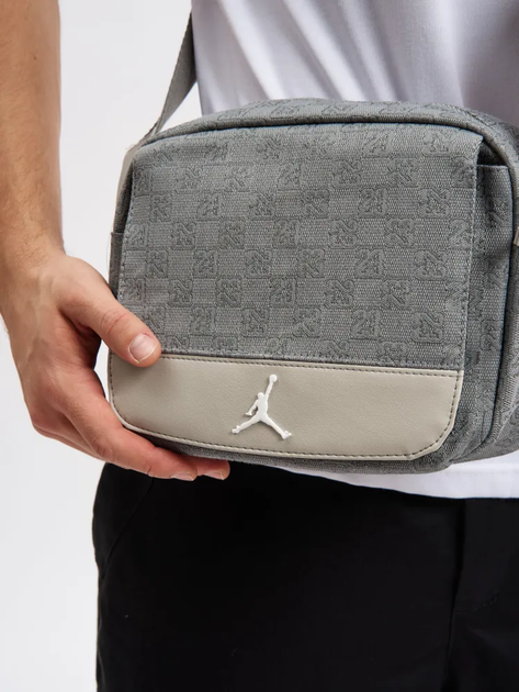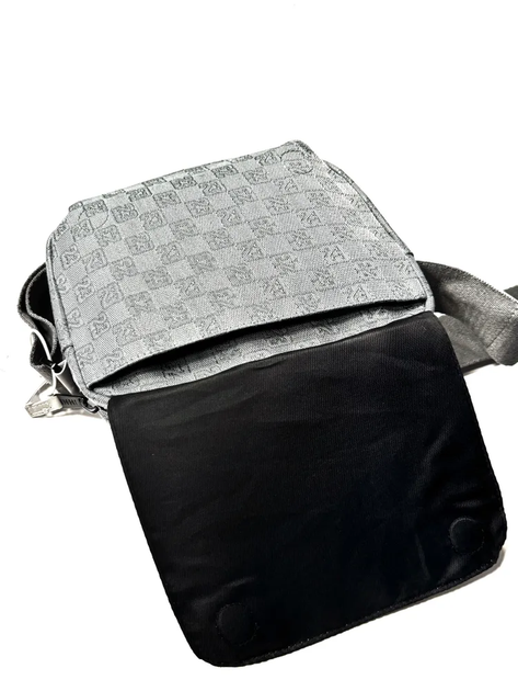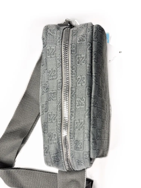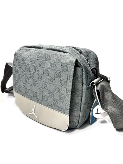 Компактна сумка через плече у сірому кольорі з логотипом у золотому виконанні. Має стильний текстурний візерунок із цифрою 23 та зручний регульований ремінь. Відмінно підійде для повсякденного використання. Розмір: 24x19x7 см